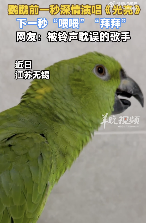 一岁的鹦鹉唱着周深的光。近日,江苏无锡。黄颈亚马逊吴小姐正在学唱@kabula_ Zhou Shen的《光》...